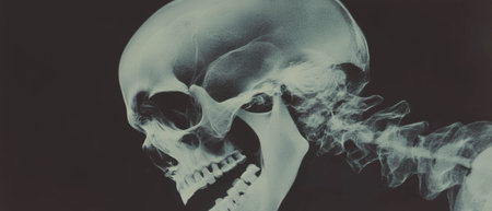 X-ray of human skull displaying grainy texture and subtle ghostly effects in profile view