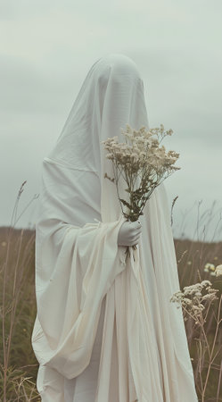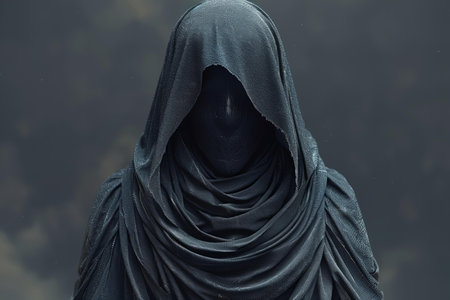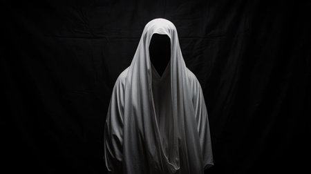 A haunting, cloaked figure with an obscured face, draped in a flowing white robe, stands against a stark black background, evoking a sense of mystery and the unknown.