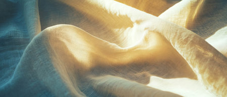 An ethereal fabric is captured in motion, illuminated by sunlight. The flowing material displays soft textures and a range of cream and white hues. The composition and lighting create an abstract and dynamic visual, suitable for various design applications and commercial purposes.