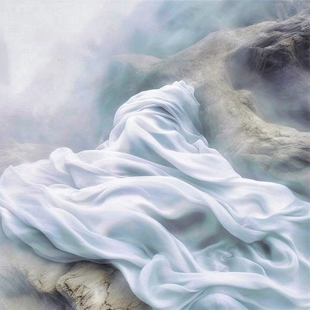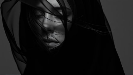 This captivating monochrome image presents a mysterious figure enveloped by flowing fabric, creating an ethereal atmosphere in a contemporary art style.