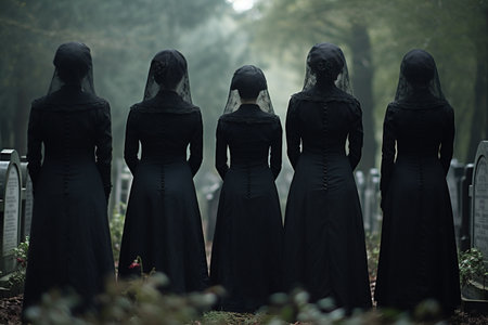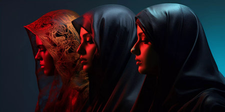 Three women wearing black veils stand in a row. The women are dressed in traditional Islamic clothing