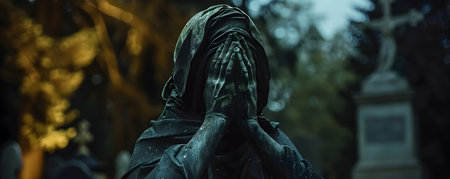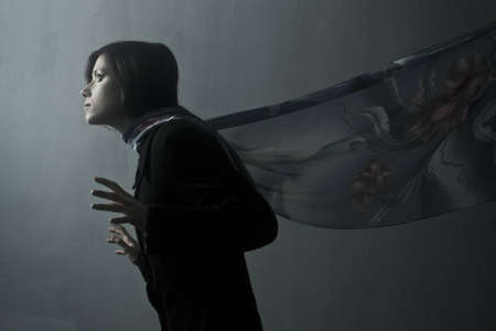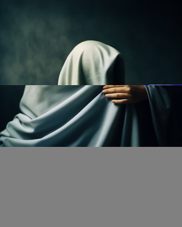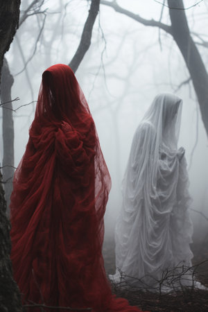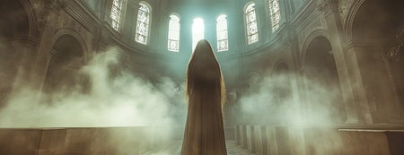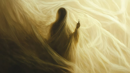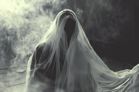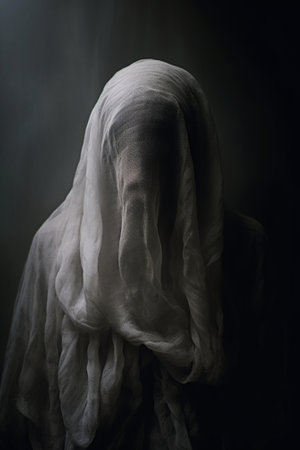 Mystical apparition of ethereal veiled figure in dark atmosphere.