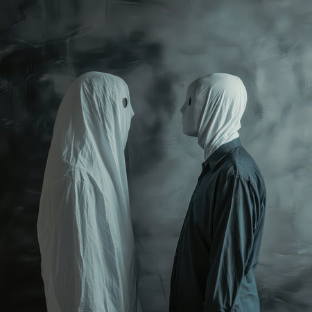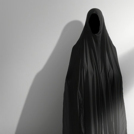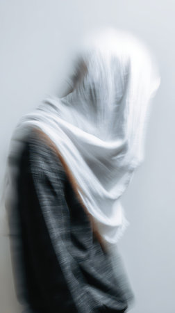 This haunting image features a figure draped in dark cloth, standing against a stark white wall, creating a striking contrast that evokes mystery and intrigue.