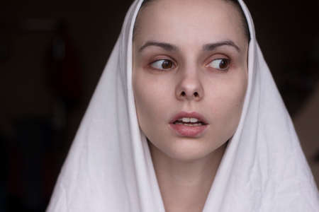 Young woman in a white robe covers her face with a veil.