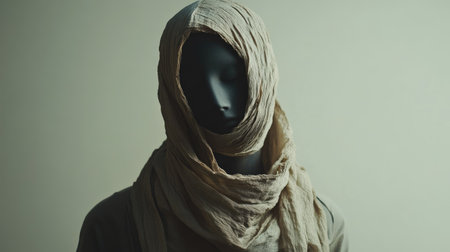 This captivating image features a mannequin draped in a cream-colored scarf, creating an aura of mystery and elegance within a simple studio backdrop.