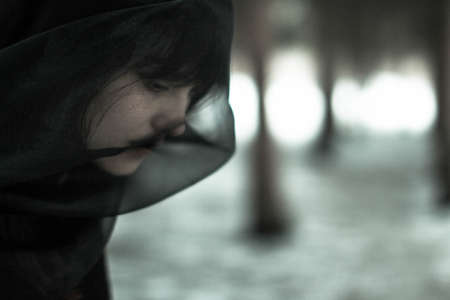 Close-up face of a beautiful young single woman in depression in a black veil, in a black and white concept