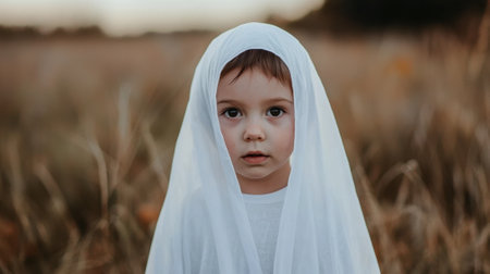 A young child is wearing a white veil and standing in a field of tall grass. The child's face is the main focus of the image, and the overall mood is one of innocence and curiosity