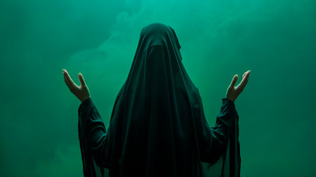 Young woman in black niqab praying with green foggy background