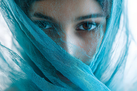 Close-up of a woman's face partially covered with a blue lace fabric, emphasizing her brown eyes and mysterious expression
