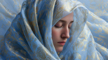 A tranquil young lady gently rests with her eyes shut, enveloped in a flowing, ornate blue fabric that exudes sophistication and serenity.