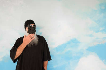 Mature man with long gray beard against cloudy blue sky background wall wearing face mask to protect