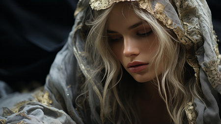 A stunning woman adorned with a golden headdress and blonde locks exudes an air of elegance and grace