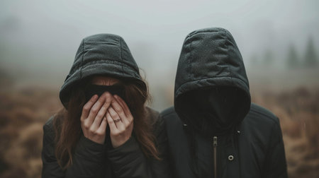 Portrait of young couple covering their face with their hands and looking at the camera