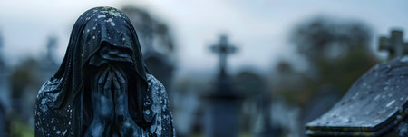 Stone statue in a cemetery surrounded. Sad grieving angel in graveyard with old destroyed tombstones