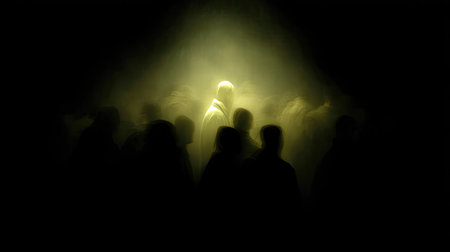 A captivating scene of mysterious figures in shadow, surrounded by a fog that creates an ethereal light effect. The atmosphere evokes intrigue and emotion.