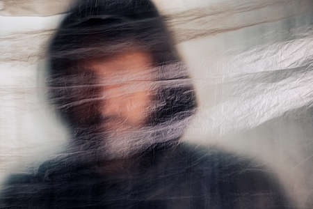 Drug addiction concept, blurred male person with hoodie behind plastic curtain, selective focus