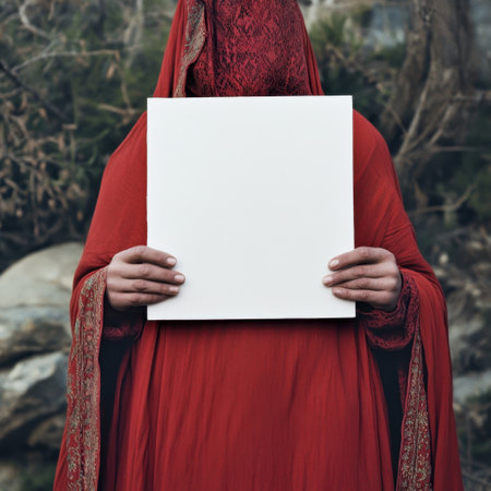 A woman in a red dress is holding a white sign