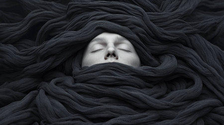 Serene face emerging from dark, flowing fabric, showcasing tranquility and depth, perfect for themes of introspection and mindfulness in art photography