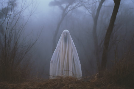 A moody horror edit of a ghost with a sheet over it's head. Standing in a forest.