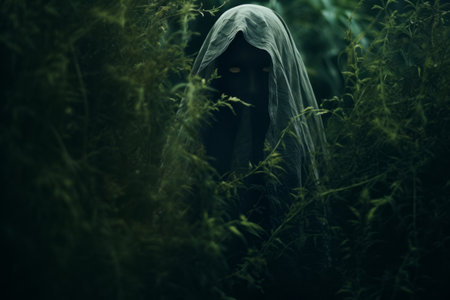 Mystical apparition of ethereal veiled figure in dark atmosphere.