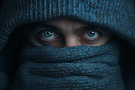 striking dramatic portrait of man in black hood with intense gaze, face partly covered by scarf