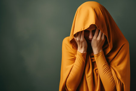 Beautiful young woman in yellow hoodie covering face with hand and looking at camera isolated on grey, Exhausted mother covering her face in distress With copyspace for text, AI Generated