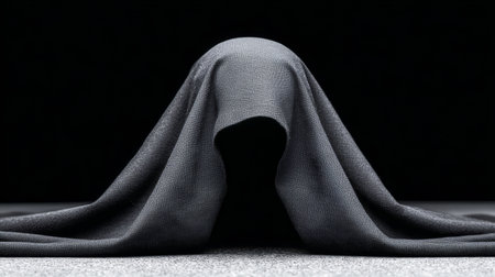A dark fabric drapes over a hidden figure, creating a sense of mystery and intrigue. The setting is minimalistic, with focus on the concealed form and shadows.