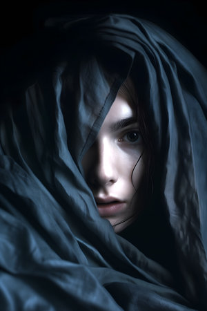 Serene face emerging from dark, flowing fabric, showcasing tranquility and depth, perfect for themes of introspection and mindfulness in art photography