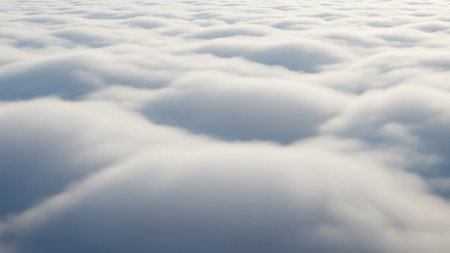 An aerial view shows a vast expanse of soft, fluffy white clouds stretching to the horizon