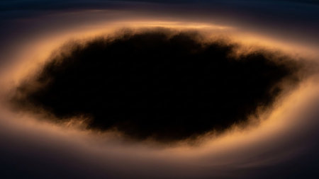 A dark, oval void is surrounded by soft, swirling clouds illuminated by a warm golden light, creating an abstract and ethereal atmospheric effect.