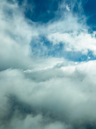 Among fluffy clouds billowing forming a cloudscape in the sky