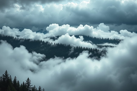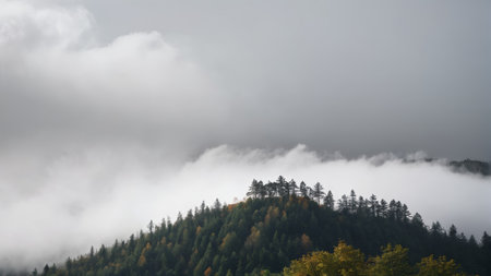 Captivating misty landscape with layered forests and atmospheric fog rolling over the hilly terrain This serene and ethereal scene evokes a sense of mystery tranquility