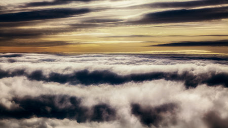 Layered clouds forming dramatic cloud inversion above landscape at sunrise. Soft golden tones and dark shadows create moody atmospheric scene with abstract and conceptual feel.
