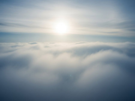 Aerial view. The drone flies over foggy and fluffy clouds. Blue sky sun and sea fog. Abstract aerial nature summer ocean sunset sea and sky background. Vacation, travel and holiday concept