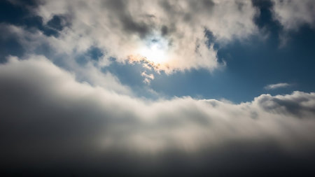 Clouds showing dramatic overcast sky with streaky clouds and a bright sunburst peeking through the upper atmosphere, capturing a moody and expansive celestial view....
