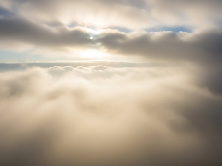 Aerial high view of dramatic clouds and sun, flying in sunset clouds