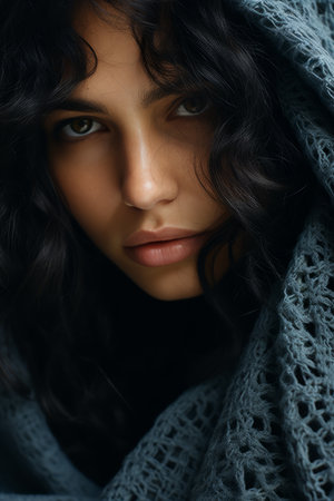 Beauty portrait of brunette woman dressed in dark blue scarf. Female portrait from a three-quarter angle on black background. Hands cover face with a scarf