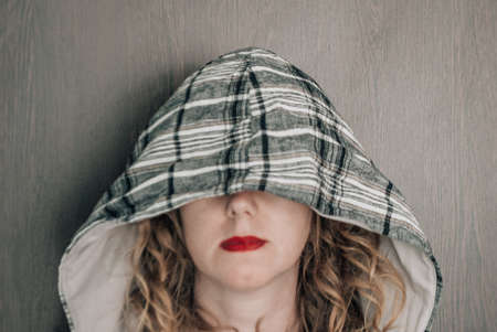 The woman hides her face behind the hood. Stylish female posing in a hoodie. Portrait of a young woman covering her face with a hood.