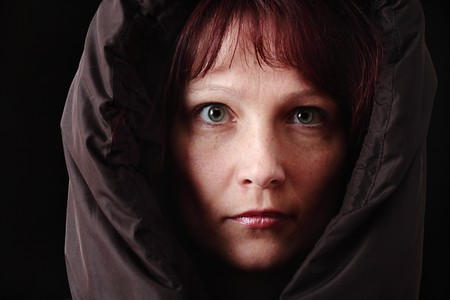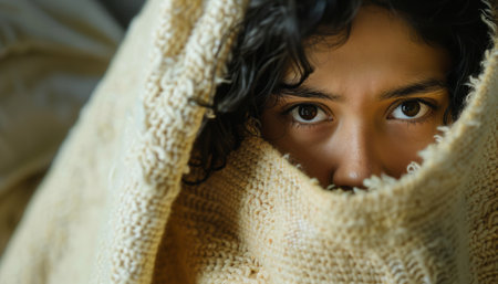 A woman sitting wrapped in a blanket, her gaze directed towards the camera lens. She appears comfortable and relaxed as she makes eye contact with the viewer.