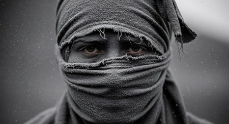 Close up of a man in a dusty, ragged scarf covering his face, with only his eyes visible, concept of war victim or refugee, disaster, apocalypse.