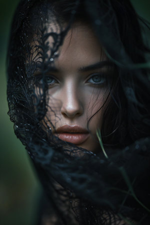 A woman enveloped in a black veil, her identity concealed, presenting a striking and enigmatic appearance. A mysterious lady model with a veil covering her face, AI generated