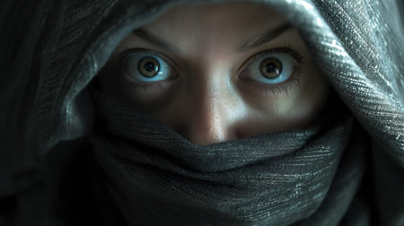 Intense eyes peer out from the shadows of a silver hooded cloak, giving an aura of mystery and concealment.