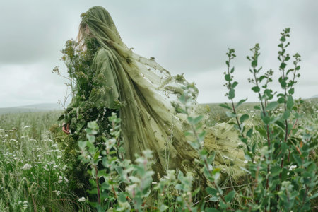 Woman in green cloak standing in grass and wildflowers field surrounded by nature beauty under the sun