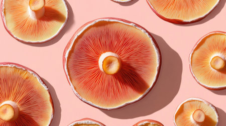 This vivid close-up image features a collection of colorful mushrooms arranged on a soft pink background, showcasing their intricate textures and details. Perfect for culinary or nature-themed projects.