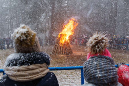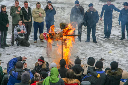 Grodno, Belarus - February 25, 2017: The ritual burning of effigies of Winter. It means the end of winter and beginning of spring.