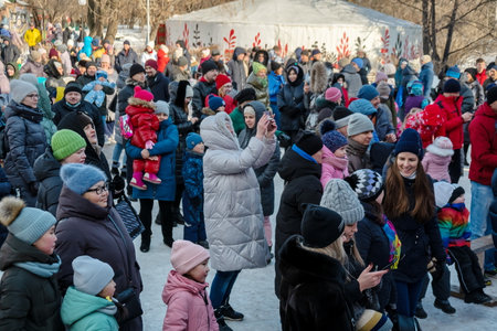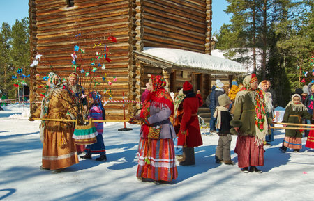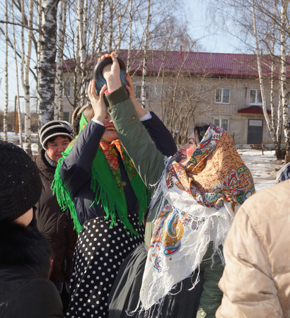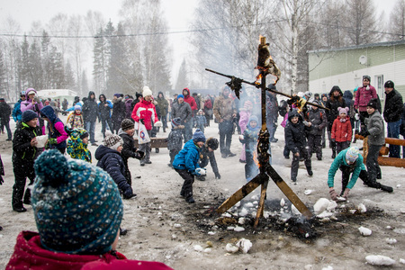 Kirov, Russia - March 13, 2016: People during the celebration of the end of winter named Maslenitsa in village Shichovo near Kirov city in 2016