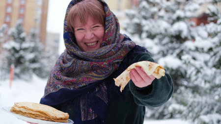 Slavic national festival Maslenitsa or shrovetide. Women in headscarf eat big tasty pancakes, have fun on winter pancake holiday week.