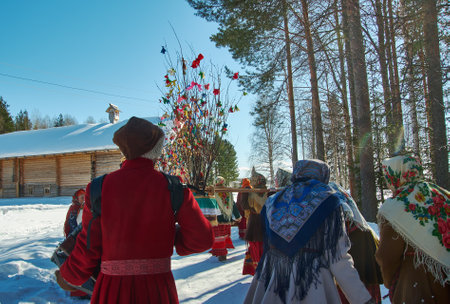 Village of Semenkovo, Vologda, Russia - March 13, 2021: Holiday of Shrovetide in Russia. People carry a doll to be burned