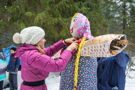 The effigy of carnival is in a forest glade. Ivanovo, Russia, February 22, 2015. On the holiday of Maslenitsa.