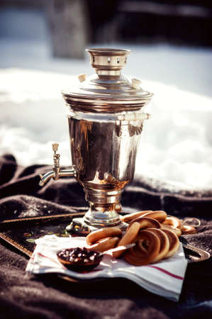 Russian samovar with bagels and jam. Tea party outdoors. Retro